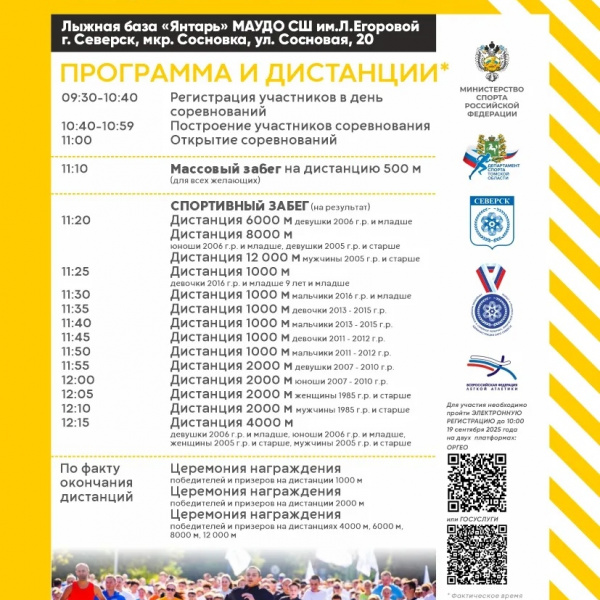 Администрация ЗАТО Северск информирует Вас о том, что 20 сентября 2025 года в 10:40 часов на лыжной базе «Янтарь» МБУДО СШ им.Л.Егоровой (мкр.Сосновка, ул.Сосновая, 20) для жителей ЗАТО Северск состоится «Кросс нации – 2025» (далее – Кросс) в рамках Всероссийского дня бега.